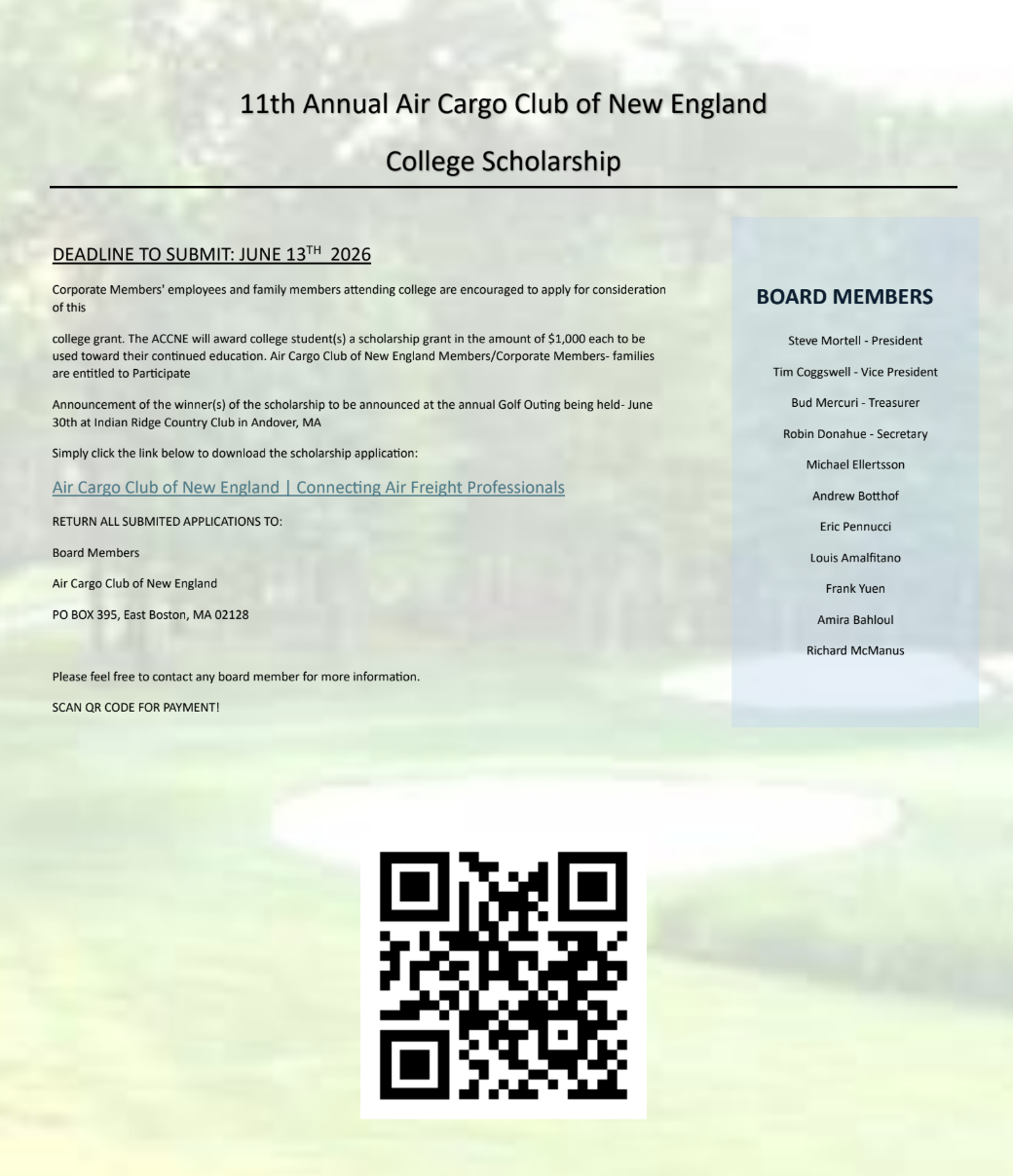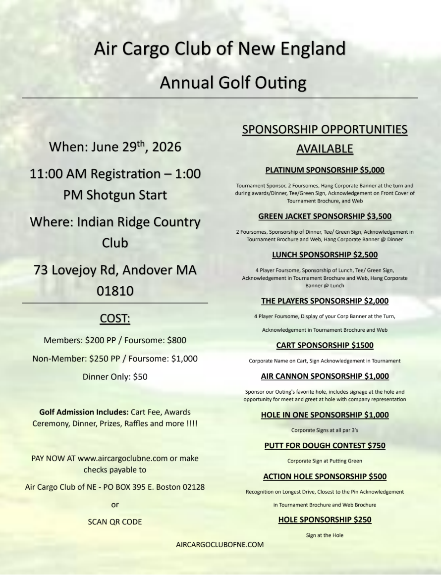 Join us for the Air Cargo Club of New England’s Annual Golf Outing on June 29th starting at 11:00 AM, a premier day of golf, networking, and community in support of the air cargo industry in New England. This long‑standing event brings together professionals, sponsors, and members of the air freight community for friendly competition on the course and valuable opportunities to connect, celebrate industry camaraderie, and support ACCNE’s mission, including scholarships for future industry leaders and local charitable efforts. Whether you’re looking to network, enjoy a day outdoors with colleagues, or give back to the community, this golf outing is a highlight of the year you won’t want to miss.